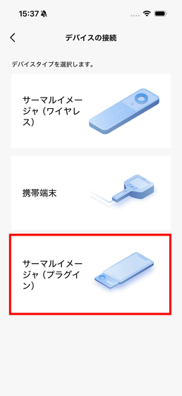 You can change the camera image by tapping the icon in the center. You can choose from three options: 'Thermal' which shows only thermal images, 'Visible Light' which shows images taken with your smartphone camera at the same time, and 'Merge' which overlays the two.