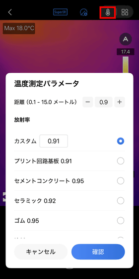 The Mini2Plus V2 allows you to adjust measurement parameters to improve temperature accuracy, allowing you to customize the distance and emissivity of the target. Tap the thermometer icon at the top of the app screen to display the adjustment screen shown below.