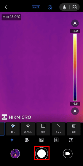 When you start the app with the Mini2Plus V2 connected to your smartphone, it looks like this. When you first start it, a description of SuperIR, which is the high-quality mode, will be displayed, so tap 'OK.'