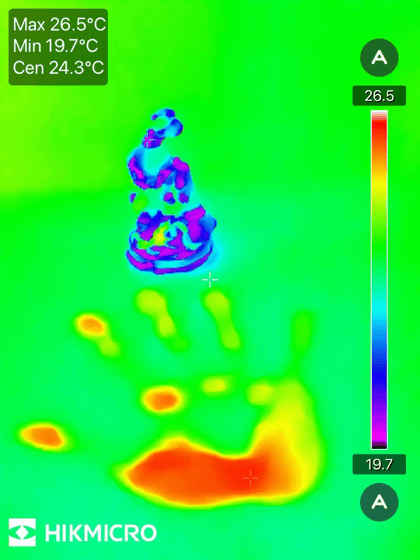 I took a photo of the moment I put my hand in front of the figure and then took it away.The heat from my body heat was transferred to the desk and captured on camera.