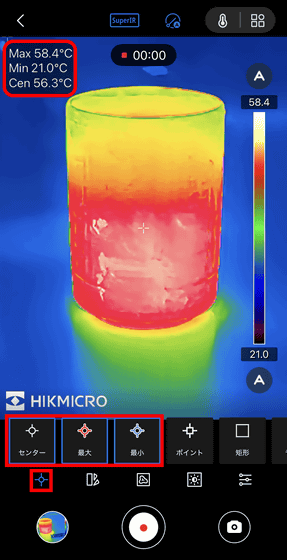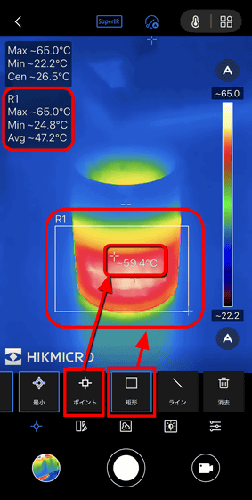 Additionally, you can tap on the 'Point' button to measure the temperature at any location, and swipe to select the area you want to measure the center, maximum, and minimum.