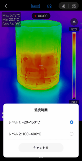 The rightmost icon allows you to set the 'Temperature Range,' 'Temperature Units' (which switches between Celsius, Fahrenheit, and Kelvin), 'Temperature Alarm' (which sounds an alarm when a certain temperature is detected), 'Rotation' (which rotates the camera screen by 90 degrees), and 'Temperature Scale' (which toggles the display of the temperature scale on the right side of the screen). This time, tap 'Temperature Range.'
