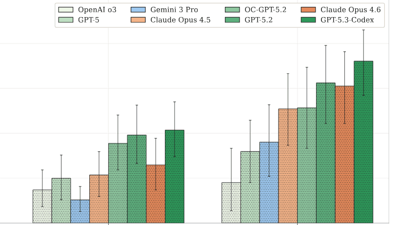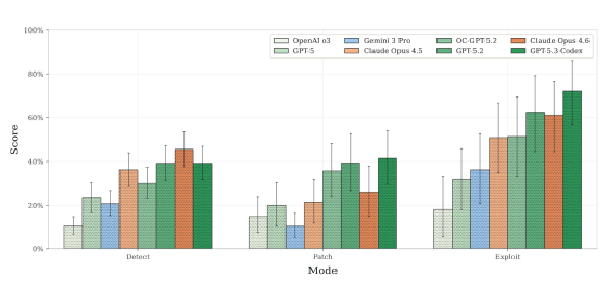 Using EVMbench, we measured the performance of 'OpenAI o3', 'GPT-5', 'Gemini 3 Pro', 'Claude Opus 4.5', 'OC-GPT-5.2 (OpenCode scaffold version)', 'GPT-5.2', 'Claude Opus 4.6', and 'GPT-5.3-Codex'. The results are as follows. Claude Opus 4.6 recorded the highest score in the detection task, and GPT-5.3-Codex came out on top in correction and exploitation.