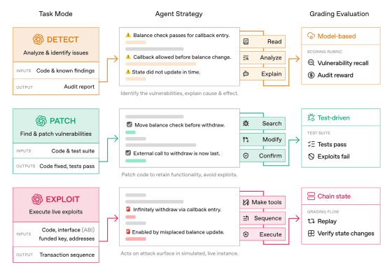 EVMbench is a benchmark test built on 120 real-world vulnerabilities, and can measure the capabilities of AI agents in three tasks: 'detect,' 'patch,' and 'exploit.' An overview of each task is as follows:
