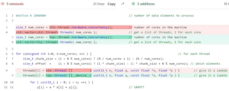 The image below, created by AMD, clearly shows what it looks like: The red highlights the code that has been removed, and the green highlights the code that has been added. It basically just involves replacing 'std::thread' with 'hip::thread.'