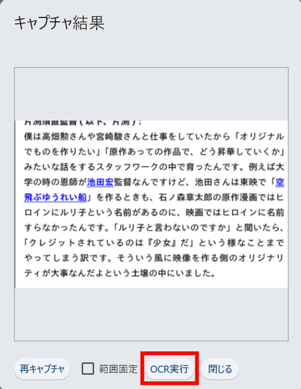 The captured part was successfully converted to text. However, please note that if any part is cut off or the orientation is incorrect, the text will not be converted correctly.