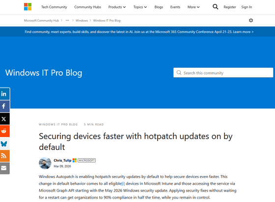 Windows Update, the monthly update that delivers security updates and bug fixes for Windows, has been released. The update for March 11, 2026 (Japan time) includes two 'Critical' and eight 'Important' updates. It also announced that 'Hot Patching,' which minimizes the need for reboots, will be enabled by default for some licenses.