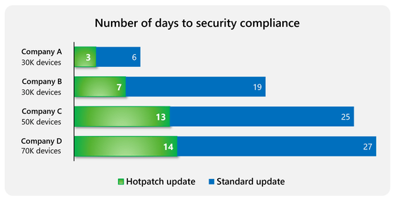 Enabling hot patching can improve the speed at which updates can be distributed across an organization. A Microsoft study showed that in a company with 70,000 machines, implementing hot patching reduced the time it took to complete updates from 27 days to 14 days.