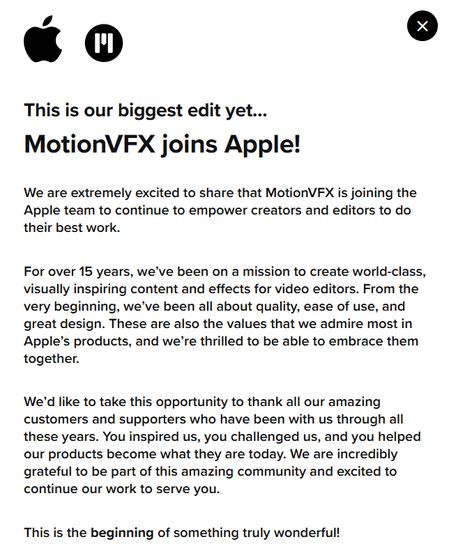We are thrilled that MotionVFX has joined Apple, and that we will continue to support creators and editors in bringing their best work to life. For over 15 years, our mission has been to create the world's best, most visually inspiring content and effects for video editors. From the very beginning, quality, ease of use, and great design have been our top priorities. These are the values that have impressed us most in Apple products, and we are delighted to share these values with Apple. We would like to take this opportunity to express our sincere gratitude to our amazing customers and supporters who have supported us over the years. You have inspired us, challenged us, and helped us grow the products we have today. We are honored to be a part of this incredible community and will continue to strive to be of service to you. This is truly the beginning of something amazing!