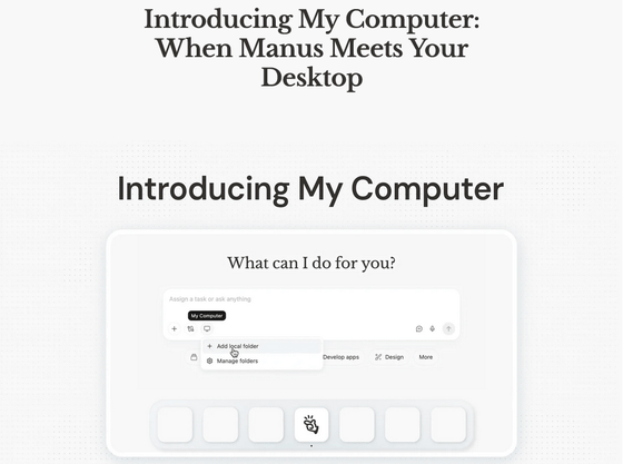 Manus has traditionally been a cloud-based AI agent, utilizing standard AI agent skills such as networking, command line, file system, and browser operations in an isolated and secure sandbox. To extend Manus's skills to local files and development environments, My Computer was announced as a core feature of the new Manus Desktop application.