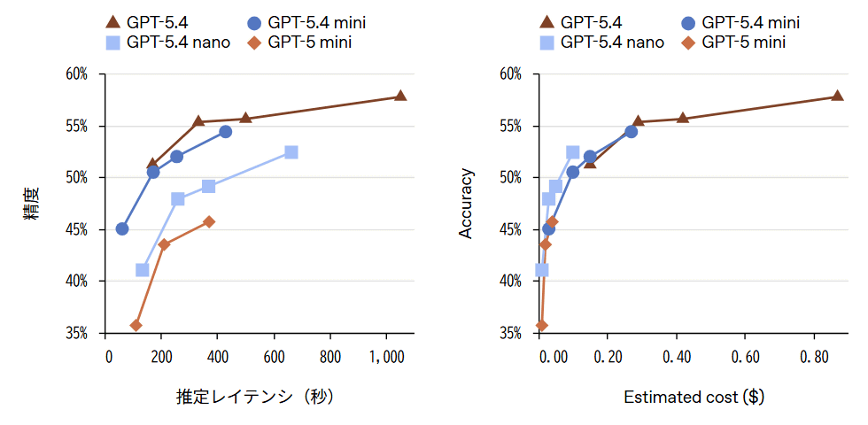 The graph below compares the coding accuracy using SWE-Bench Pro (public version) in terms of latency (left) and cost (right). While the GPT-5.4 mini has lower accuracy than the GPT-5.4, it consistently records higher accuracy than the GPT-5 mini at a similar latency. On the other hand, the GPT-5.4 nano also surpasses the accuracy of the GPT-5 mini at the same latency, and is more cost-effective than the GPT-5.4.