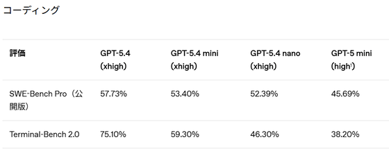 The table below compares the coding benchmark results using SWE-Bench Pro and Terminal-Bench 2.0. While the accuracy of GPT-5.4 mini/nano is still not as good as GPT-5.4, it is higher than the previous generation GPT-5 mini.