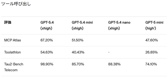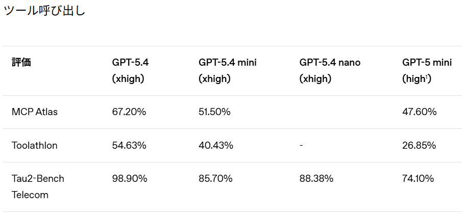 The benchmark results for tool invocation are as follows: In Tau2-Bench Telecom, the GPT-5.4 nano achieved the same accuracy as the GPT-5.4 mini.