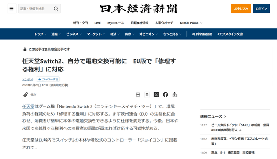 According to a report in the Nikkei Shimbun, the Nintendo Switch 2 with a replaceable battery will apparently only be sold within the EU. If consumer awareness regarding the right to repair increases, similar models may be sold in Japan and the United States as well.