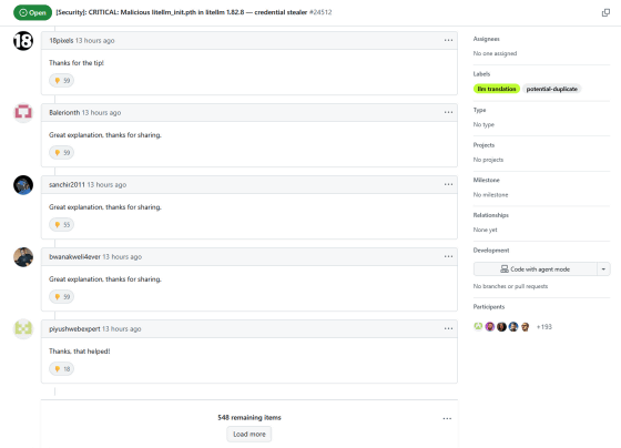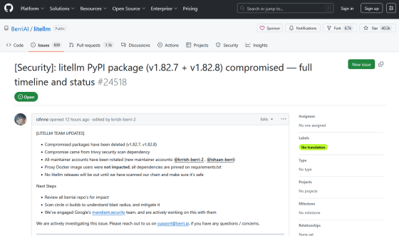 LiteLLM is a library that allows users to manage AI from different developers, such as OpenAI and Anthropic, using the same interface, and it's a popular project with over 40,000 stars on GitHub. LiteLLM is distributed on PyPI, the official Python package repository, but version 1.82.8, released at 7:52 PM JST on March 24, 2026, was found to contain malicious code, as discovered by the AI development company FUTURESEARCH .