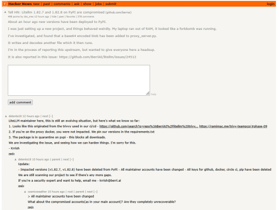 Tell HN: Litellm 1.82.7 and 1.82.8 on PyPI are compromised | Hacker News