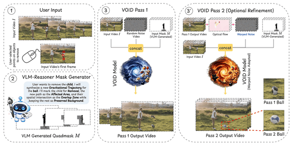 Traditional video object removal methods excel at filling in the background behind removed objects and correcting visual inconsistencies such as shadows and reflections. However, existing models often produce unnatural results when the object to be removed is colliding with or supporting other objects. VOID was developed to generate physically plausible counterfactual videos in such complex scenarios.