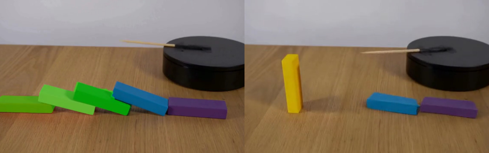 In short, the biggest feature of VOID is that it can simulate the physical causal relationships of how the surroundings would behave if an object were removed from a video. For example, if you use VOID to remove the domino in the middle of the row in a video of dominoes falling (left), the edited video (right) will show that the subsequent dominoes remain standing.