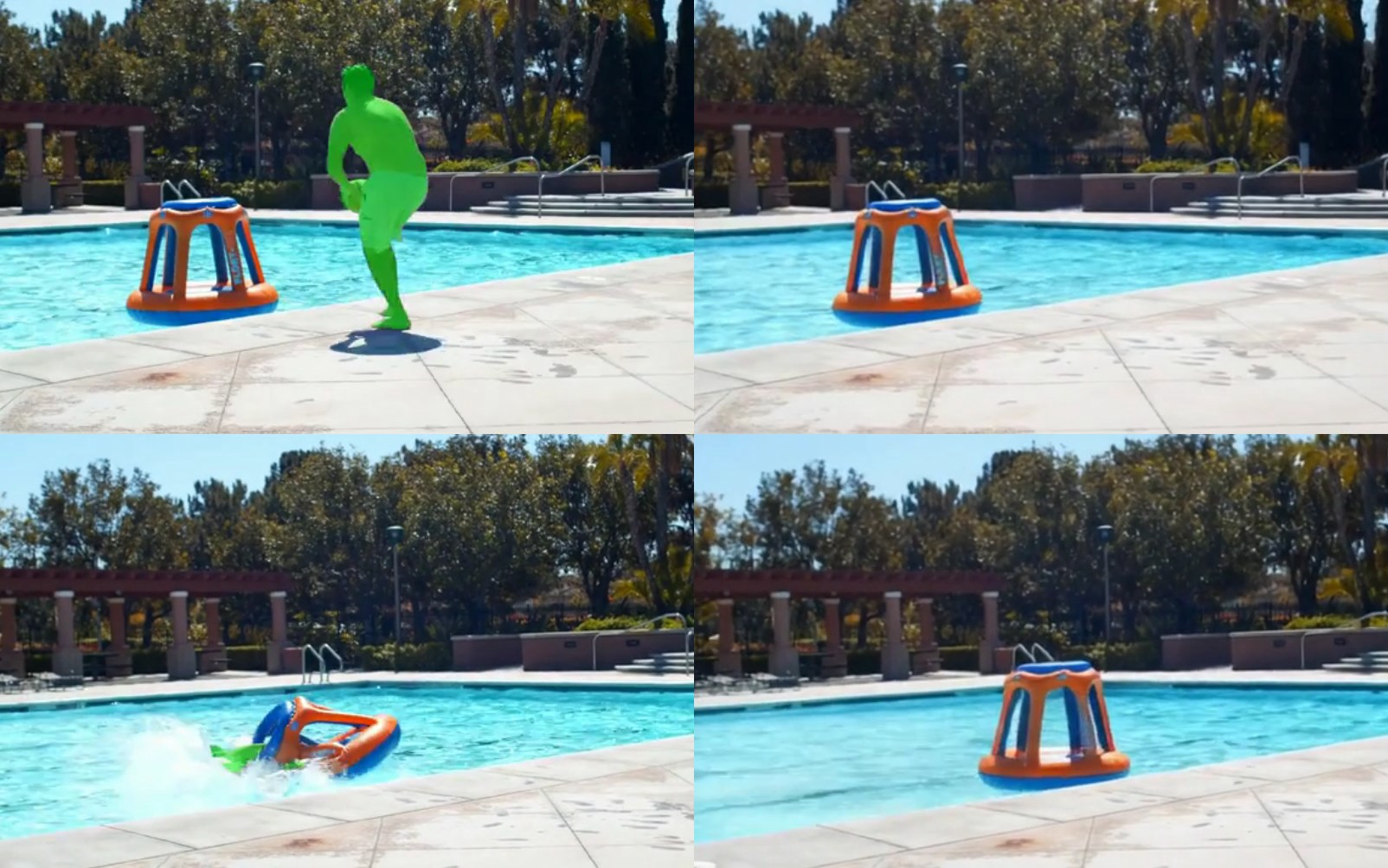 When you edit a video (two images on the left) showing a person jumping into a pool and creating a big splash, using the VOID function to remove only the person (two images on the right), you get no splash and the inflatable ring barely moves.