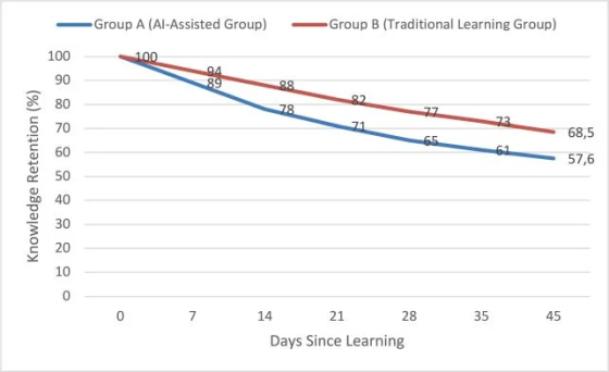 The research team not only compared the average accuracy rates on a test 45 days later, but also graphed how much knowledge was retained over time, with the initial learning level set at 100%. In the graph below, the blue line represents the group that used AI, and the red line represents the group that learned using conventional methods without AI. The vertical axis shows the knowledge retention rate, and the horizontal axis shows the number of days since learning. After 7 days, a difference began to emerge between the AI-using group and the group that learned using conventional methods, and it can be seen that the group that learned using conventional methods consistently maintained a higher rate of knowledge retention thereafter.
