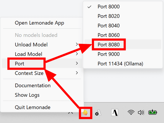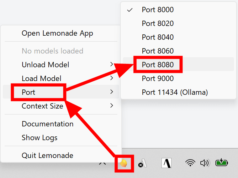 First, right-click the Lemonade server icon in the taskbar and click 'Port' and then 'Port 8080'.