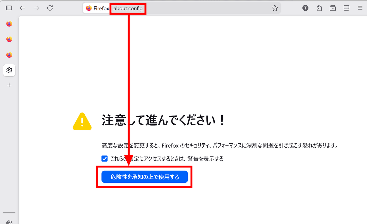 Next, type 'about:config' into the Firefox address bar and click 'I accept the risks.'