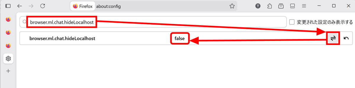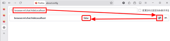 Enter 'browser.ml.chat.hideLocalhost' in the search bar and click the toggle icon for the setting with the same name. If 'false' is displayed, you're ready.