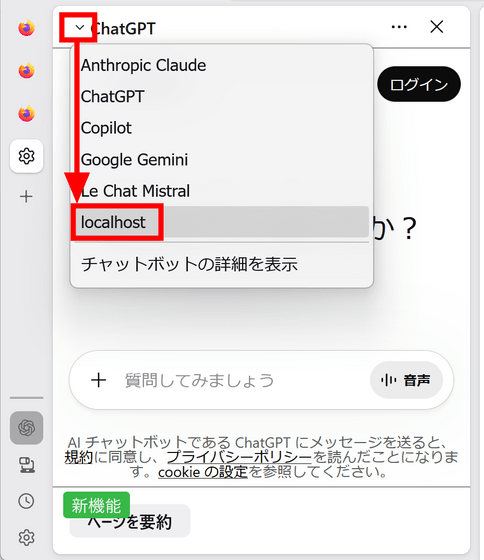 In Firefox's AI panel, 'localhost' has been added to the AI options, so click on it.
