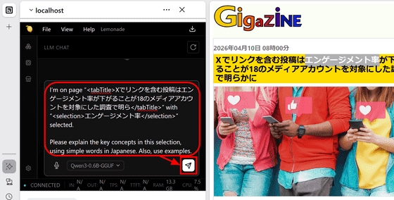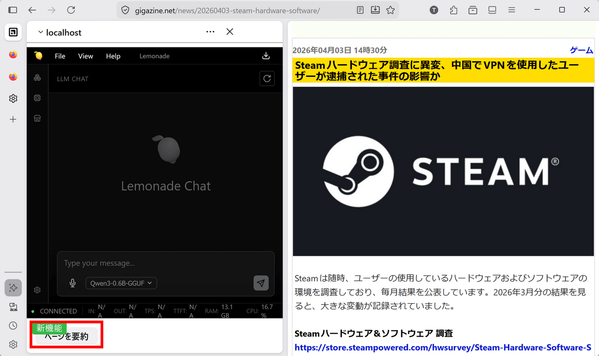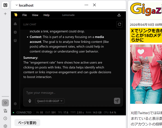 Firefox has a feature that displays AI in the sidebar, allowing you to ask questions and get advice from the AI while browsing websites. By default, only cloud-based AI services such as 'Anthropic Claude,' 'ChatGPT,' 'Copilot,' 'Google Gemini,' and 'Le Chat Mistral' are available, but there is a hidden setting to use local AI, so I tried configuring it to actually run local AI.