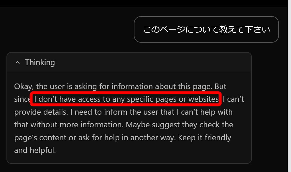 I also tried asking the AI, 'Tell me about this page,' but it seems the AI doesn't have access to the page being displayed. It might seem a little inconvenient, but it does provide peace of mind regarding privacy.