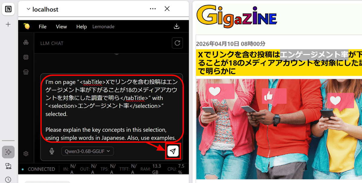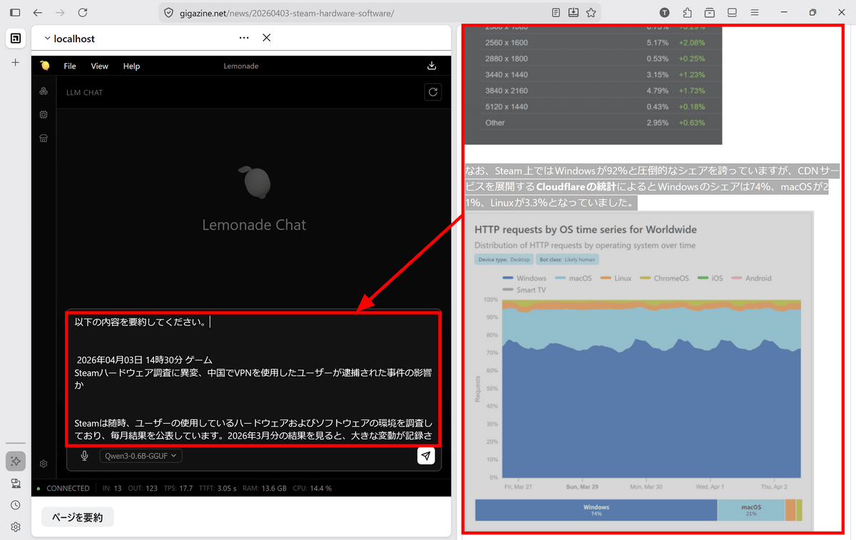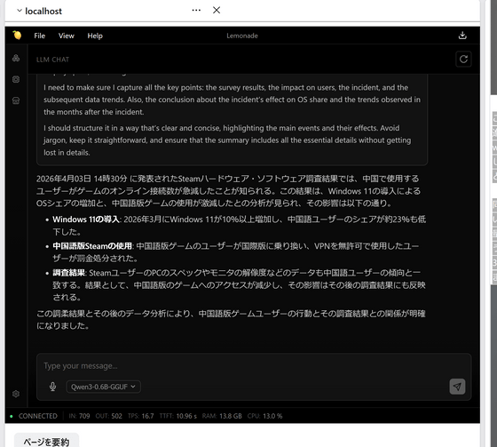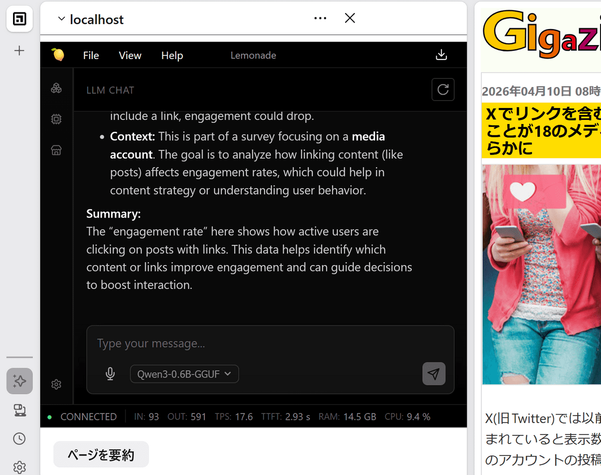 It seems that the AI can summarize information without any problems if you provide it manually. Note that the accuracy of the AI depends on the model specified in Lemonade, so if you need a higher quality answer, you can switch to a better model in Lemonade.