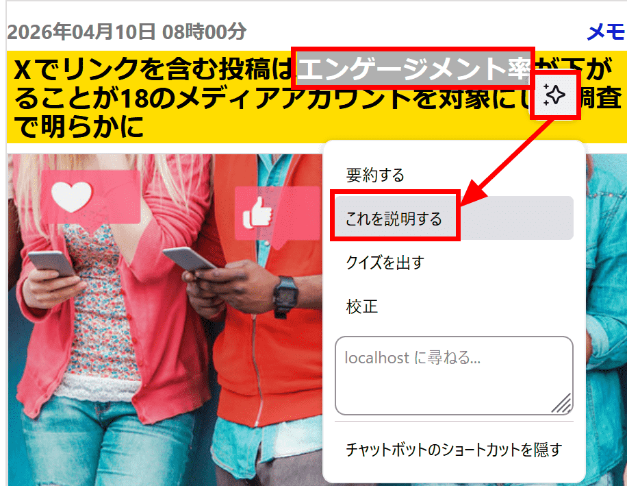 In Firefox, when you select text while browsing a website, an AI menu with a star icon appears. Let's try selecting the text 'engagement rate' and clicking 'Explain this' from the AI menu.
