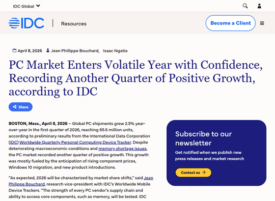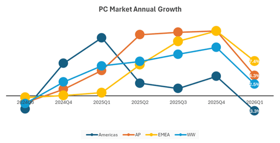 Although PC shipments grew year-on-year in the first quarter of 2026, memory shortages and the worsening global situation are beginning to impact the PC market, as evidenced by the sharp decline in growth across all regions. IDC predicted that 'PC shipments will decline further for the remainder of the period due to continued rising system prices.'