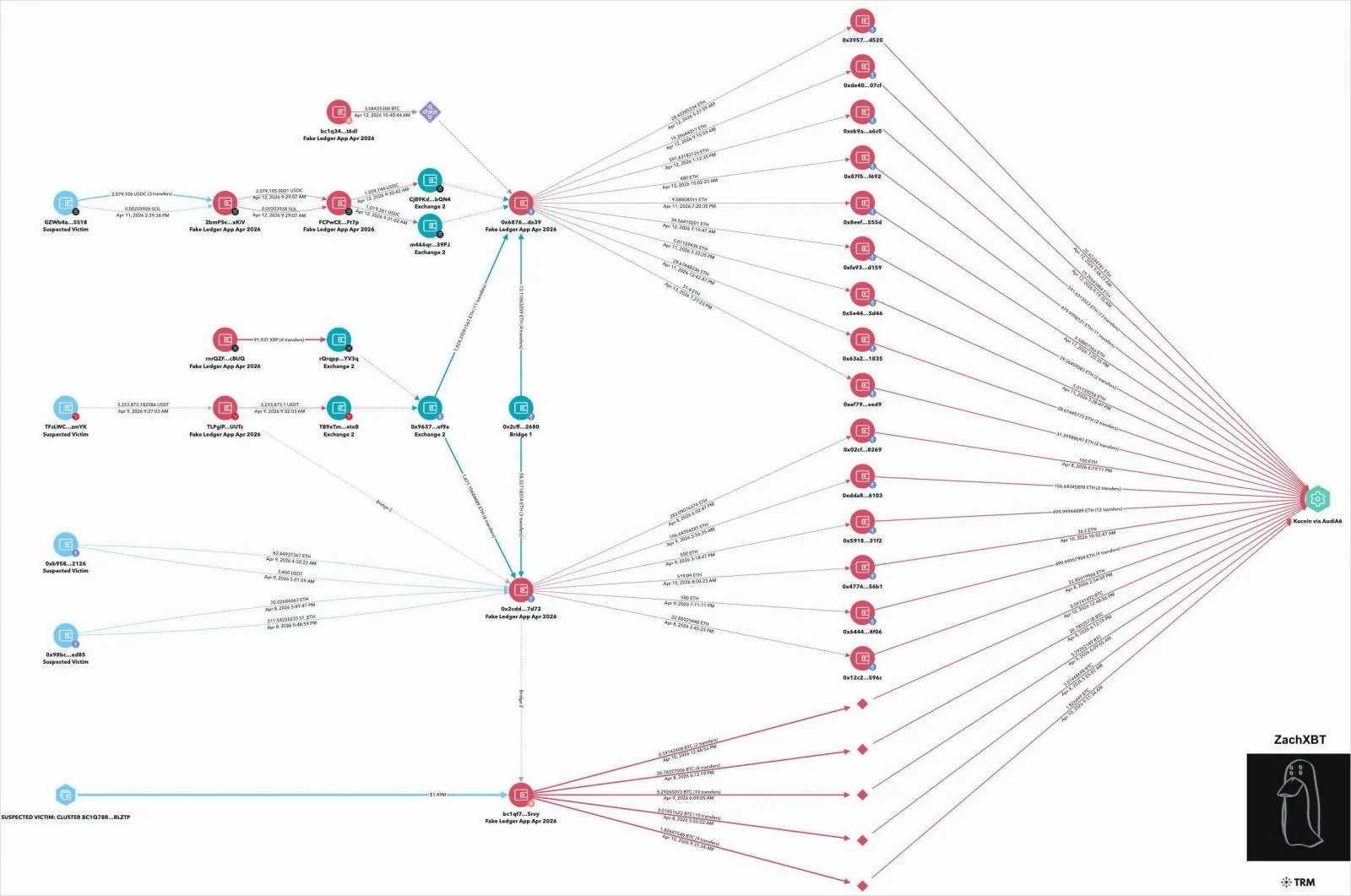 The stolen assets passed through multiple receiving addresses and were ultimately sent to over 150 deposit addresses on KuCoin, where they were linked to 'AudiA6,' a centralized mixing service that uses high fees to obscure the flow of fraudulent funds.