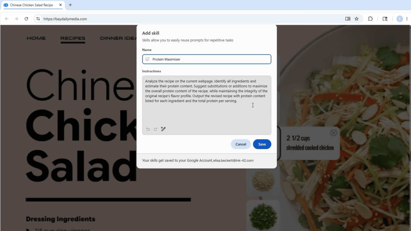 Saved skills can be edited on the spot, and new skills can be added. Google says early testers are using it for things like calculating protein content and nutritional information in recipes, comparing product specifications across multiple tabs, and extracting key points from long documents and web pages.