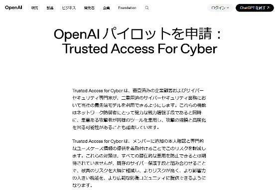 OpenAI has launched an initiative to provide security researchers with ' GPT-5.4-Cyber ,' an AI model with relaxed restrictions regarding cyberattacks. GPT-5.4-Cyber will be available to users participating in Trusted Access for Cyber (TAC) and will be used to help counter AI-based cyberattacks.