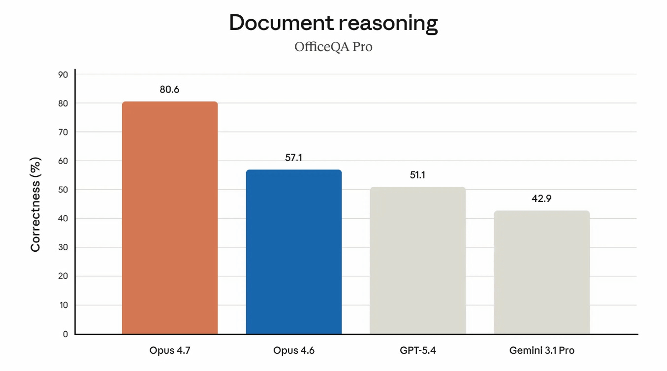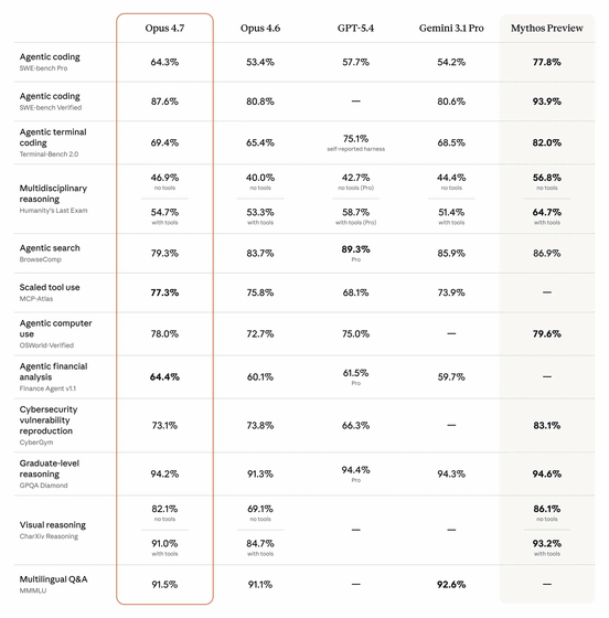 In fact, the benchmark table shows that in the visual inference tool ' ChartX Reasoning ,' Opus 4.7 achieved 82.1% without tools and 91.0% with tools, an improvement from Opus 4.6's 69.1% and 84.7%. In coding-related tests, it recorded 64.3% in ' SWE-bench Pro ,' 87.6% in ' SWE-bench Verified ,' and 78.0% in ' OSWorld-Verified ,' and even in the financial analysis test ' Finance Agent ,' it achieved 64.4%, all of which are higher than Opus 4.6.
