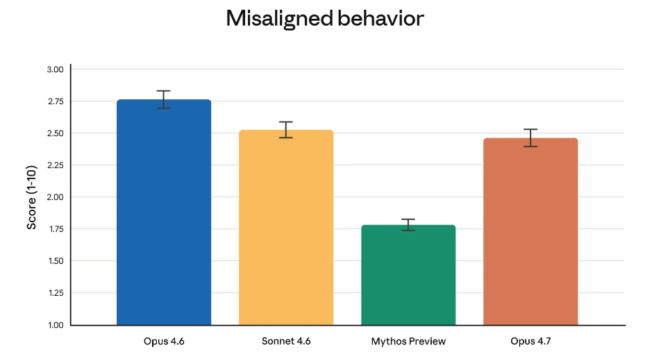 The following bar graph shows the behavioral inconsistency rate based on automated behavioral audits, with lower scores (behavioral inconsistency rate) indicating higher safety. While Opus 4.7 shows a slight improvement over Opus 4.6, Mythos Preview has a significantly lower behavioral inconsistency rate.