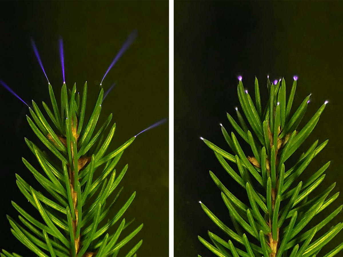 Previous studies had confirmed corona discharge in plants in the laboratory, but no scientifically observed cases in nature had been reported. The following photograph, taken in the laboratory, shows corona discharge occurring in spruce leaves.