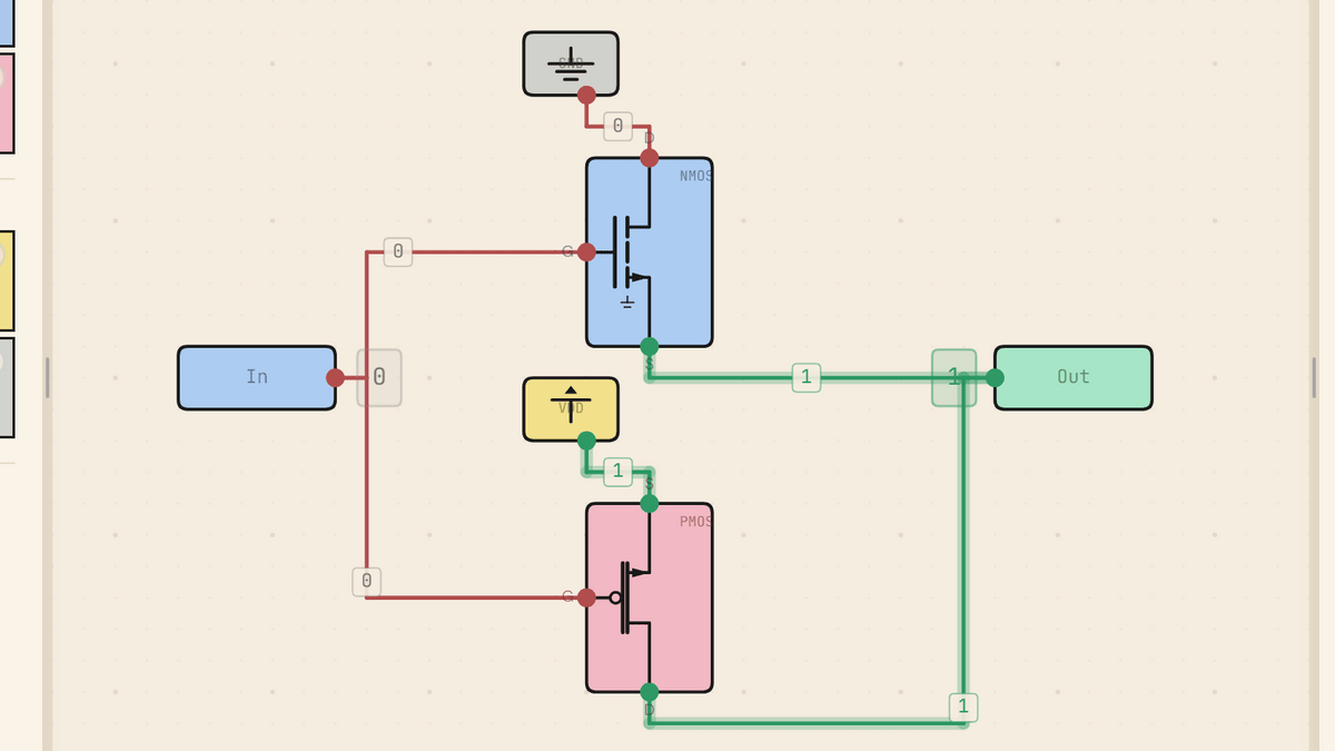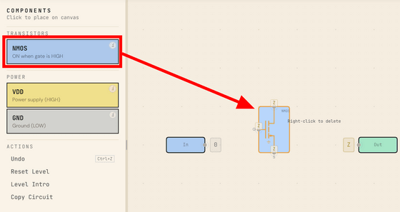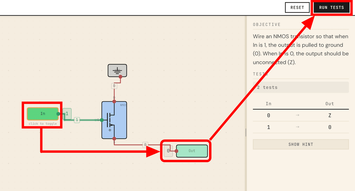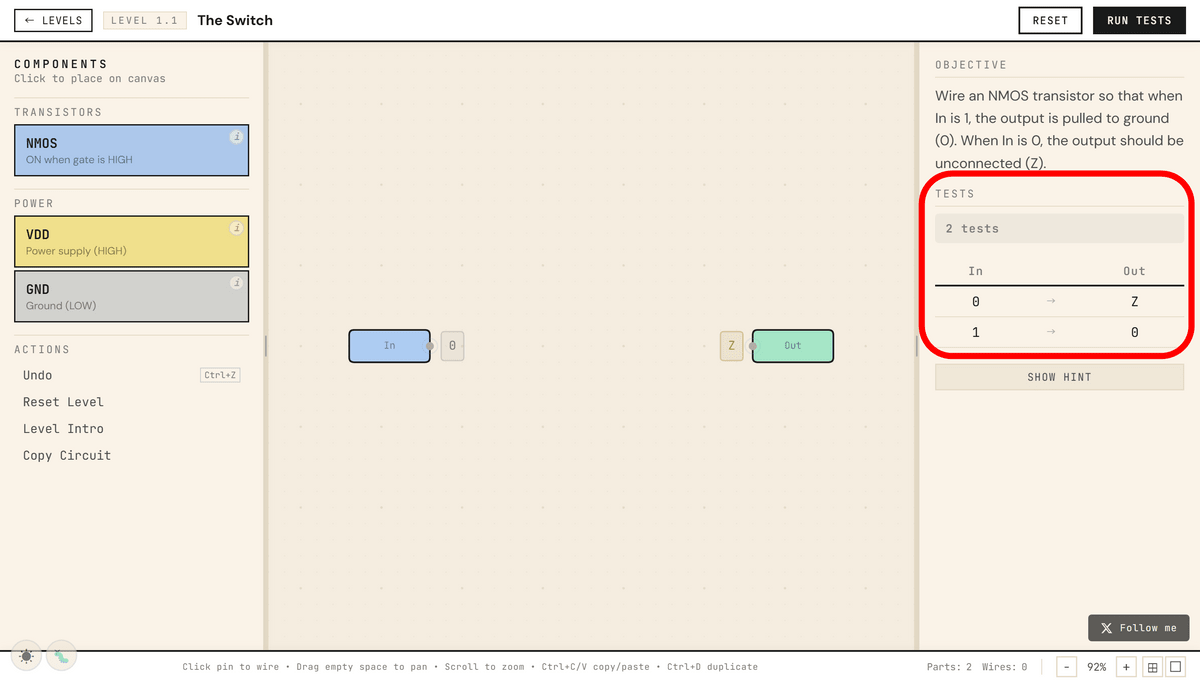 ようやくゲーム画面になりました。右端に「TESTS」という項目があり、このTESTSの項目に従うように回路を設計すれば良さそうです。今回は入力が「0」の時に切断状態である「Z」になり、入力が「1」の時に「0」になるようにすればOKとのこと。