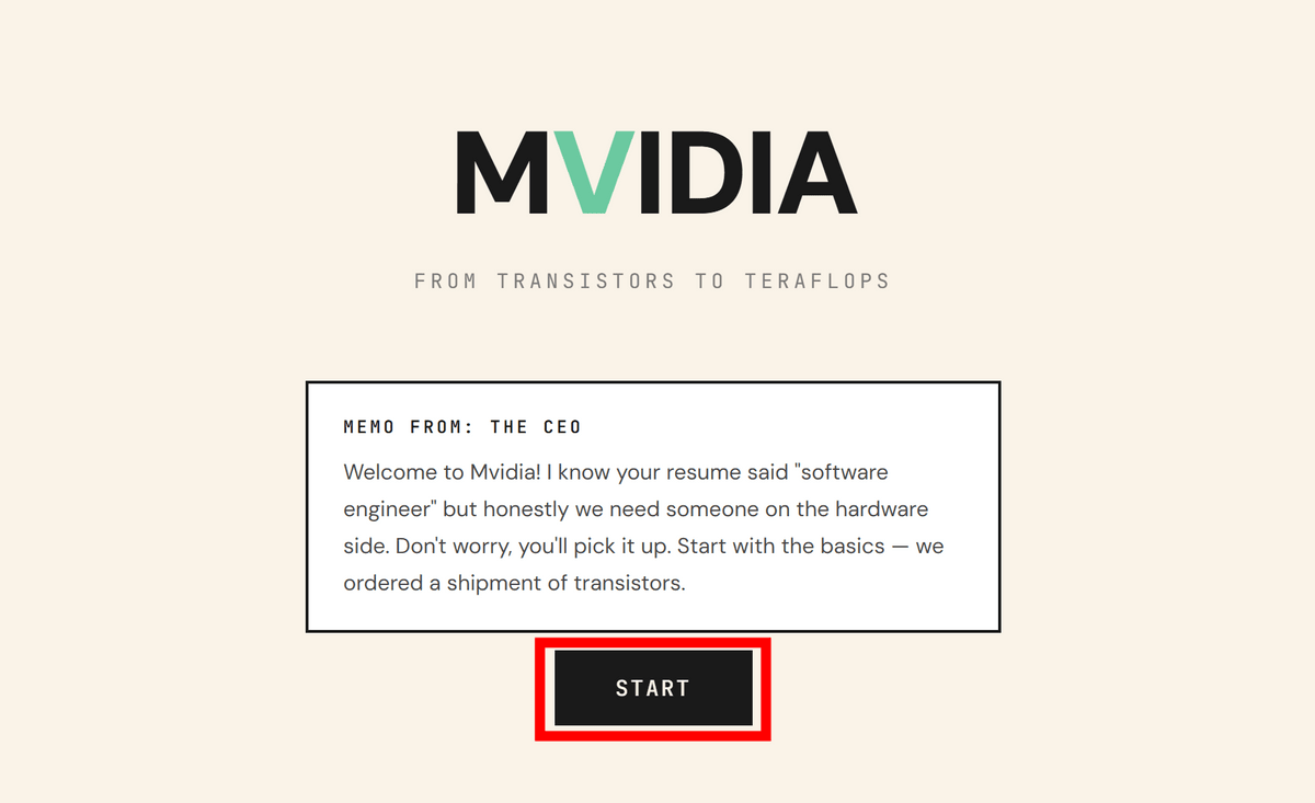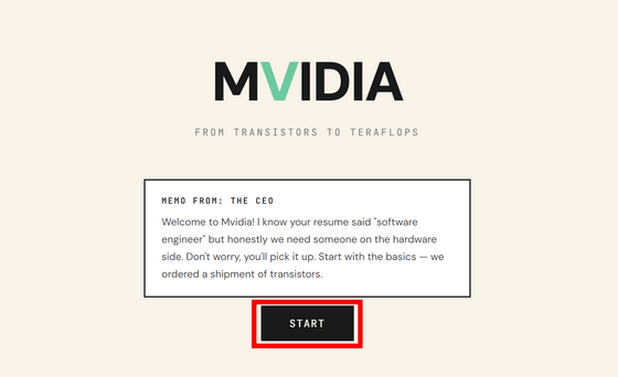 スタート画面にCEOからの手紙が表示されています。「Mvidiaへようこそ!履歴書には『ソフトウェアエンジニア』と書いてありましたが、正直なところ、ハードウェア担当の方が必要なんです。でもご安心ください、すぐに慣れますよ。まずは基本から始めましょう。トランジスタを発注しました」とのこと。「START」をクリックします。
