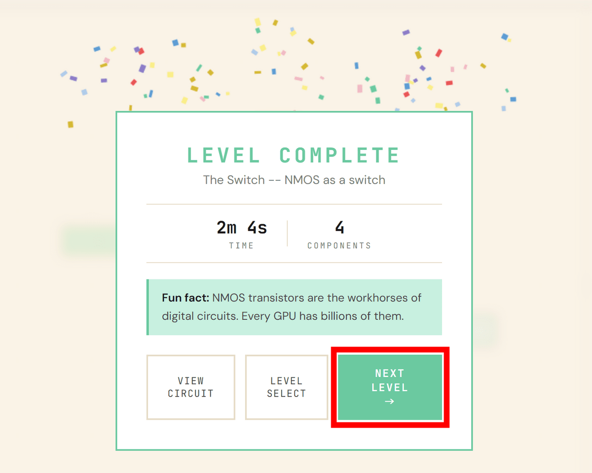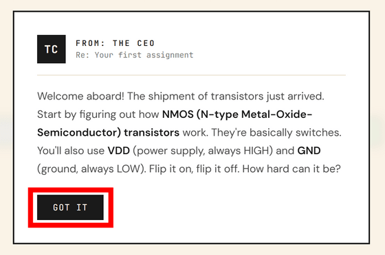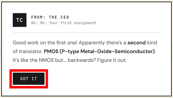 ステージを開くと再びCEOからの手紙が表示されました。今回のステージではNMOSトランジスタの動きについて学ぶとのこと。「GOT IT」をクリック。