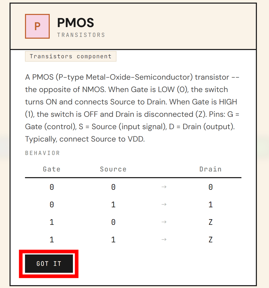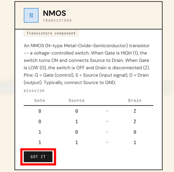 NMOSトランジスタの真理値表が表示されます。NMOSトランジスタには「Gate」「Source」「Drain」という3つのノードがあり、Gateに信号が来ている時はSourceの信号をDrainに流し、Gateに信号が来ていなければ「切断(Z)」状態になるとのこと。「GOT IT」をクリックします。