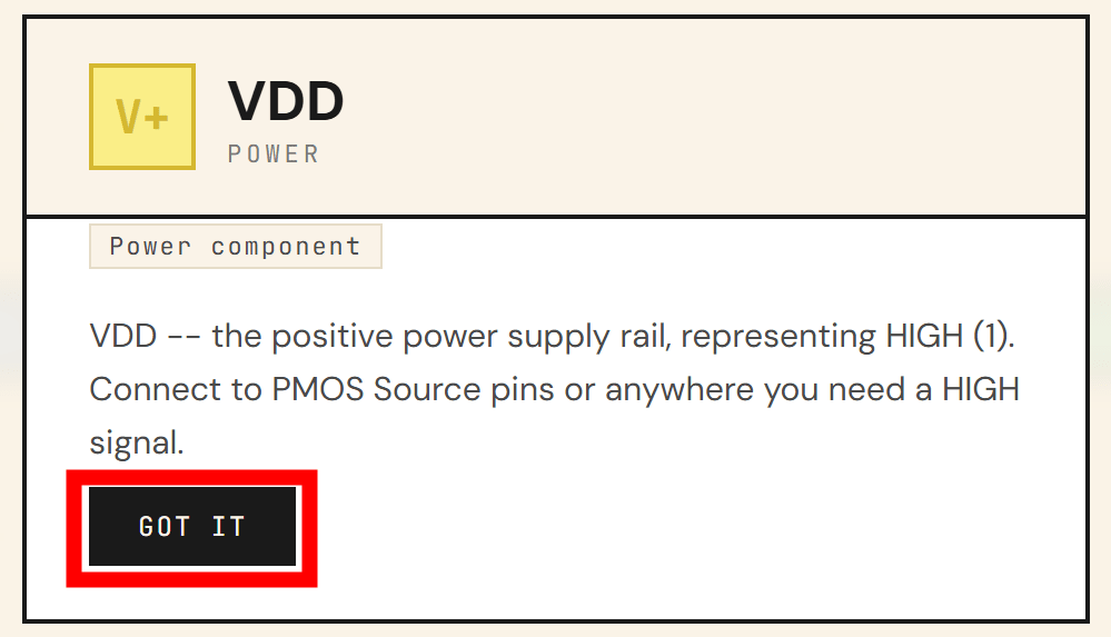 「VDD」の説明が表示されました。VDDは常に「1」の信号を送るとのこと。「GOT IT」をクリック。