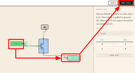 その他のコンポーネントも配置して回路をつないでみました。入力ノードである「In」をクリックすると入力信号が切り替わるので、ちゃんと正しい信号が出力ノードである「Out」に流れていることを確認して「RUN TESTS」をクリックします。