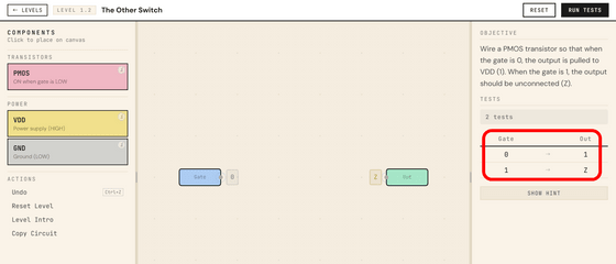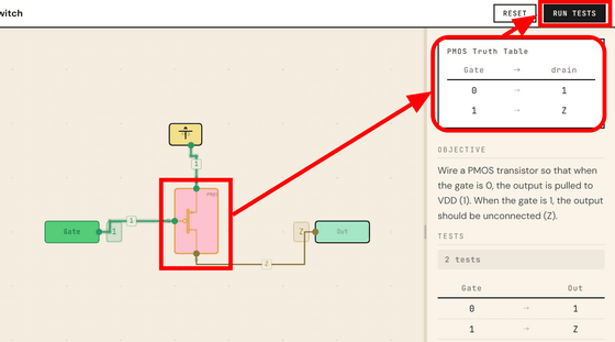 コンポーネントを配置して回路を接続した後にPMOSトランジスタをクリックすると、現状での真理値表が右上に表示されました。今後複雑な回路を構成する段階で非常に役立ちそうな機能です。真理値表の表示内容で問題無さそうなので「RUN TESTS」をクリック。
