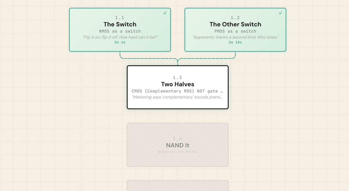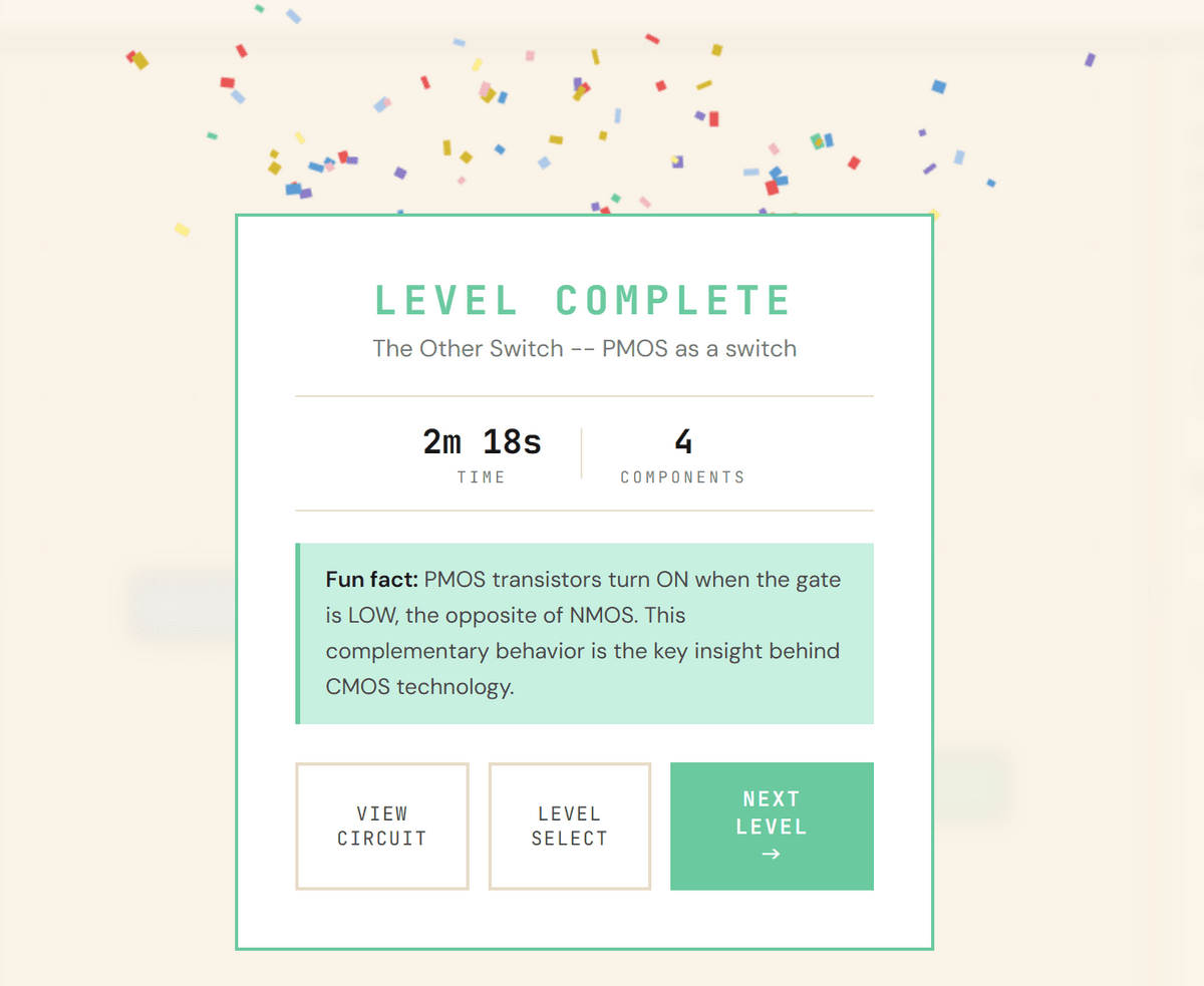 今度は「PMOS」トランジスタについて学ぶそう。CEOはNMOSの逆だと話しています。「GOT IT」をクリック。