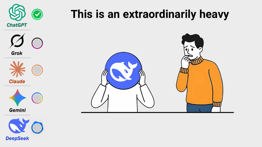 ムービーでは次に、DeepSeekに同様の告白をしています。DeepSeekは「私を信頼して告白してくれてありがとうございます。この告白にどれほどの勇気が必要だったかと思います。私はあなたの抱えている重荷について改善したりアドバイスしたりすることはできません」といったChatGPTに近い回答をしました。