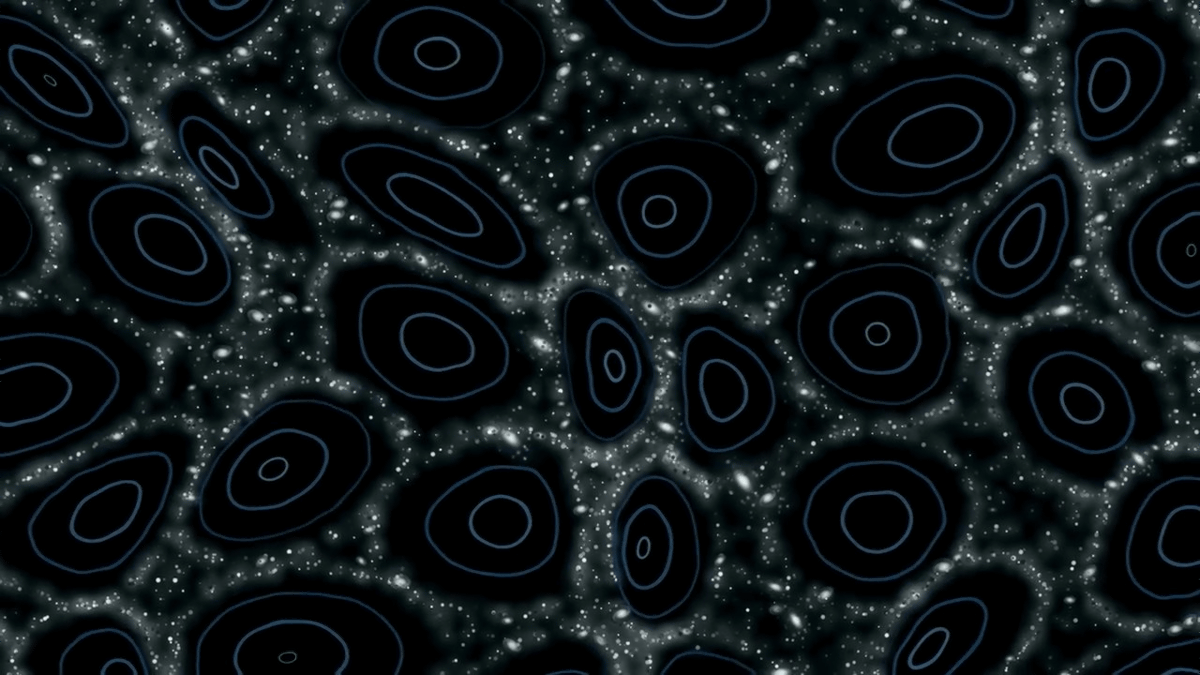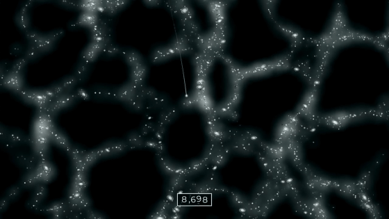 宇宙の大規模構造はシャボン玉の泡にもたとえられ、まるでボイドの周囲に銀河が張り付いているように見えます。