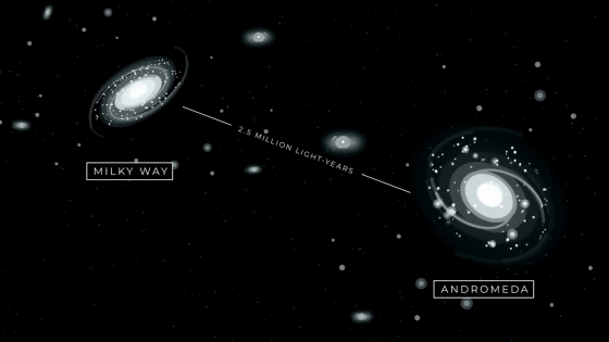 250万光年離れた場所にはアンドロメダ銀河やその周囲に浮かぶ衛星銀河があります。